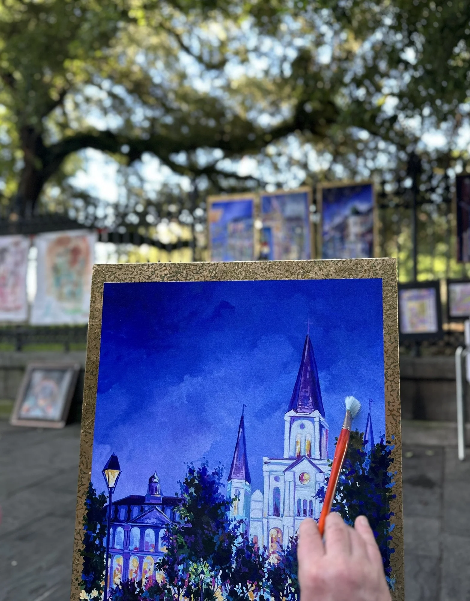A second-generation Jackson Square artist, Elaine Cummins got her first license to hang “on the fence” when she was only 16. More than forty years later, she’s still happily there.