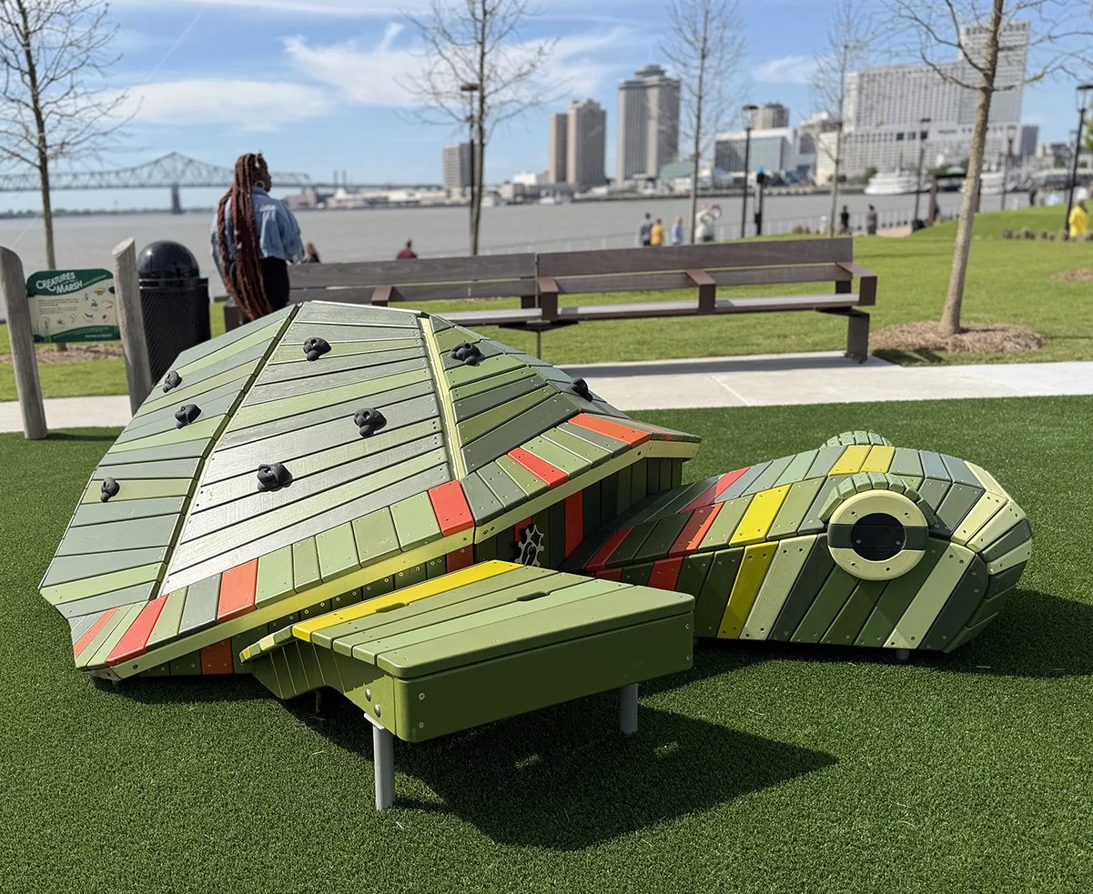 Note: For optimum viewing, enjoy this feature with a large-screen device. If your photo appears here, you may copy it onto your own computer and even share it on social media – please simply credit the photographer and French Quarter Journal – and consider joining our Readers' Circle to support our stellar creative team. These images have been optimized for fast loading on the internet, so they're not print quality. If you'd like to purchase print-quality files directly from our photographer, contact us here and we'll forward your email. Built on the site of the Governor Nicholls Street Wharfs, the entire park is built on top of a vast concrete slab that extends out over the Mississippi River.