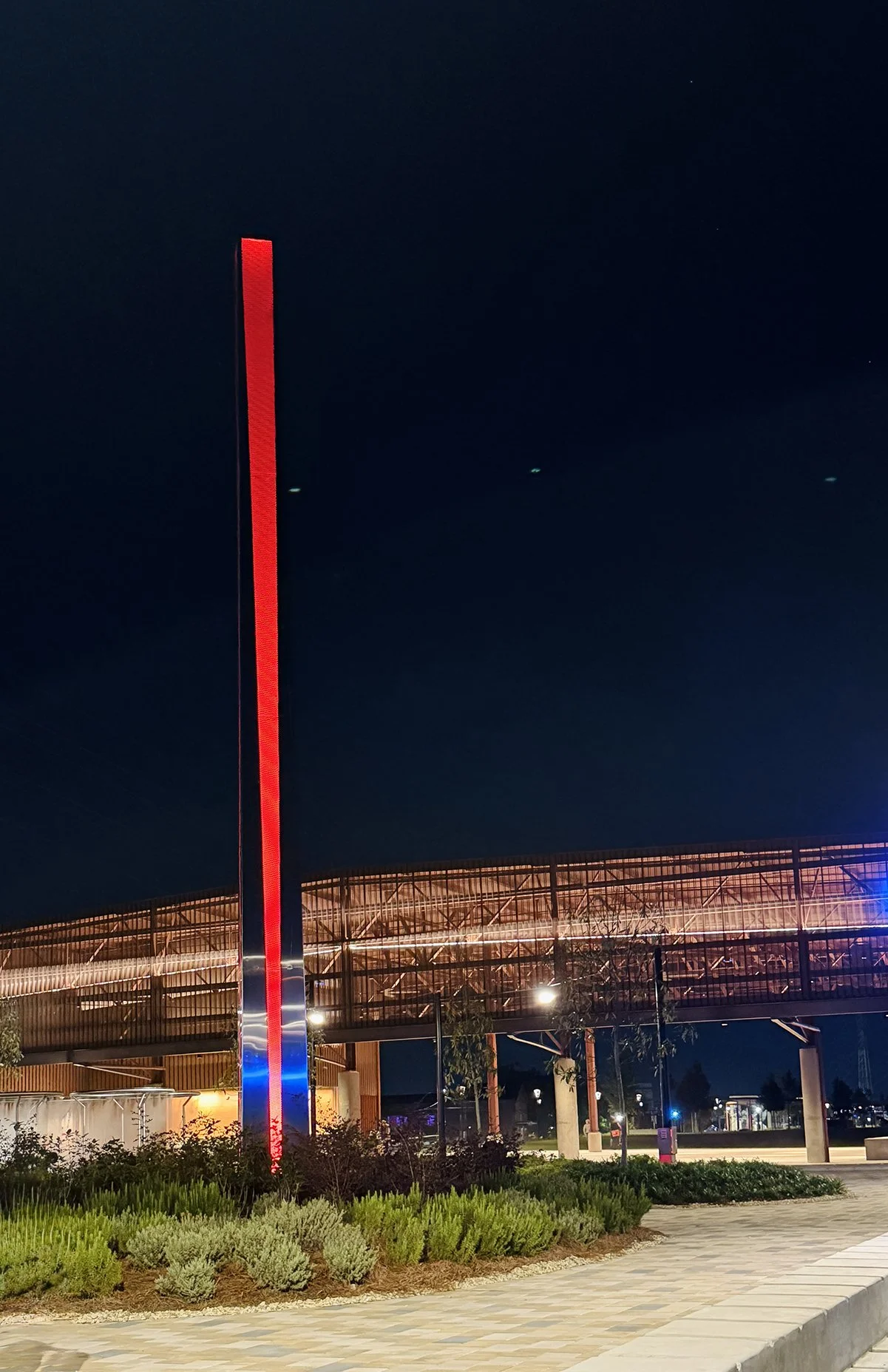 The light of the obelisk at the St. Phillip Street entrance changes colors.