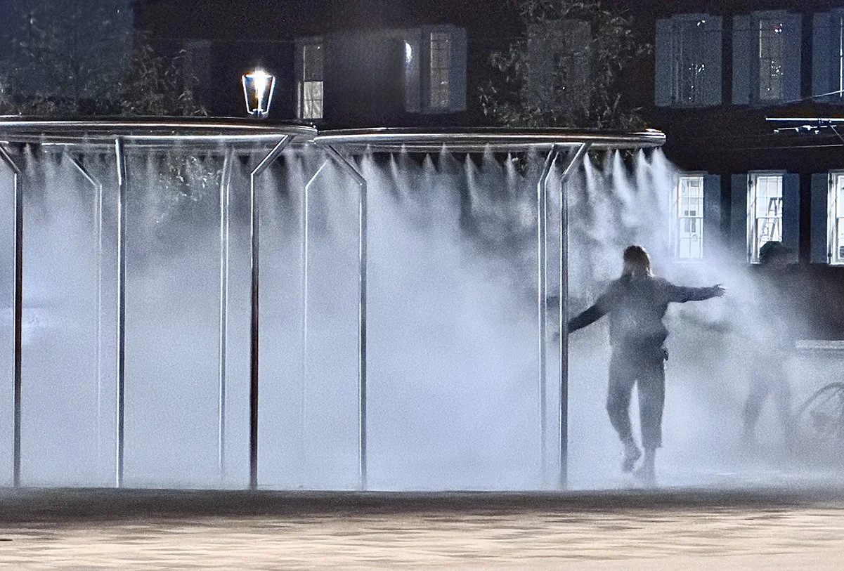 Two bicyclists take a break and dance in the misters on the opening night of the park.