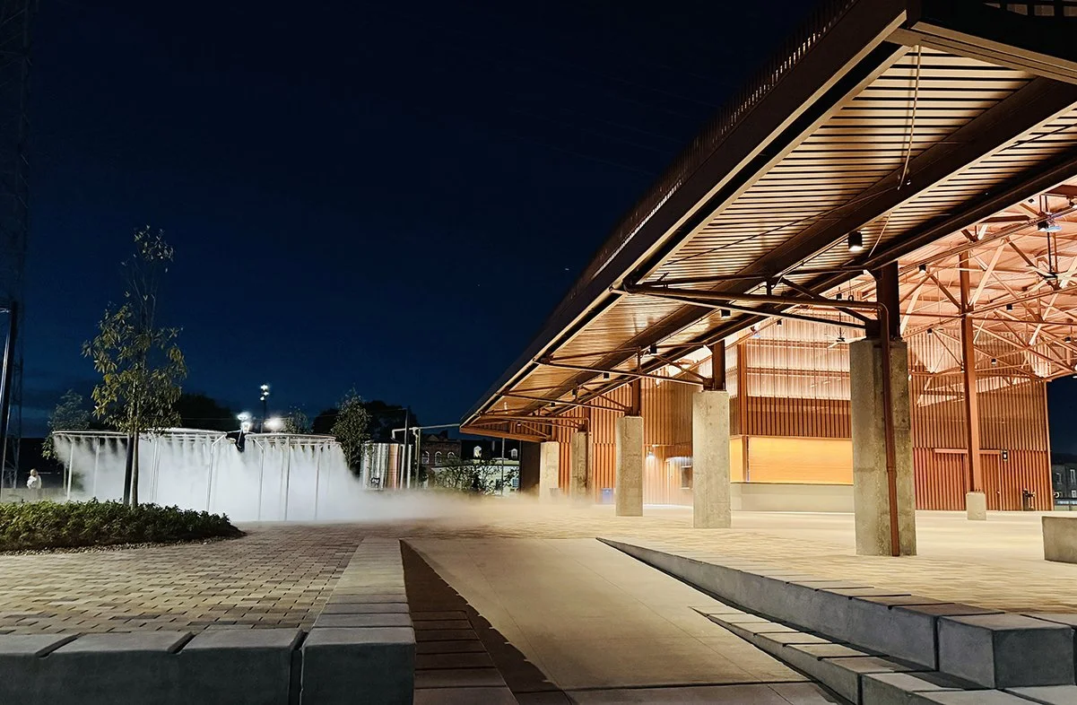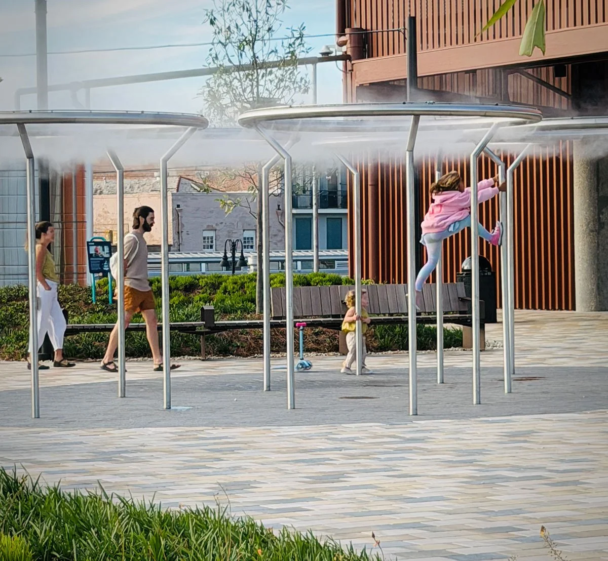 The misters in the plaza by the Front Porch received a rigorous and joyous test drive by children on the afternoon of the park’s opening day.