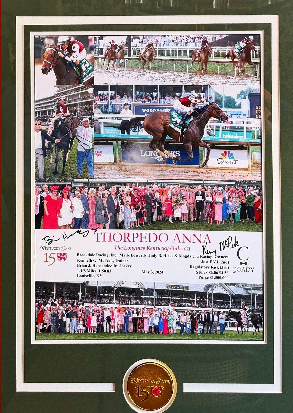 A photo montage of Thorpedo Anna’s 2024 Kentucky Derby win hangs in the den of the McPeek’s French Quarter home.