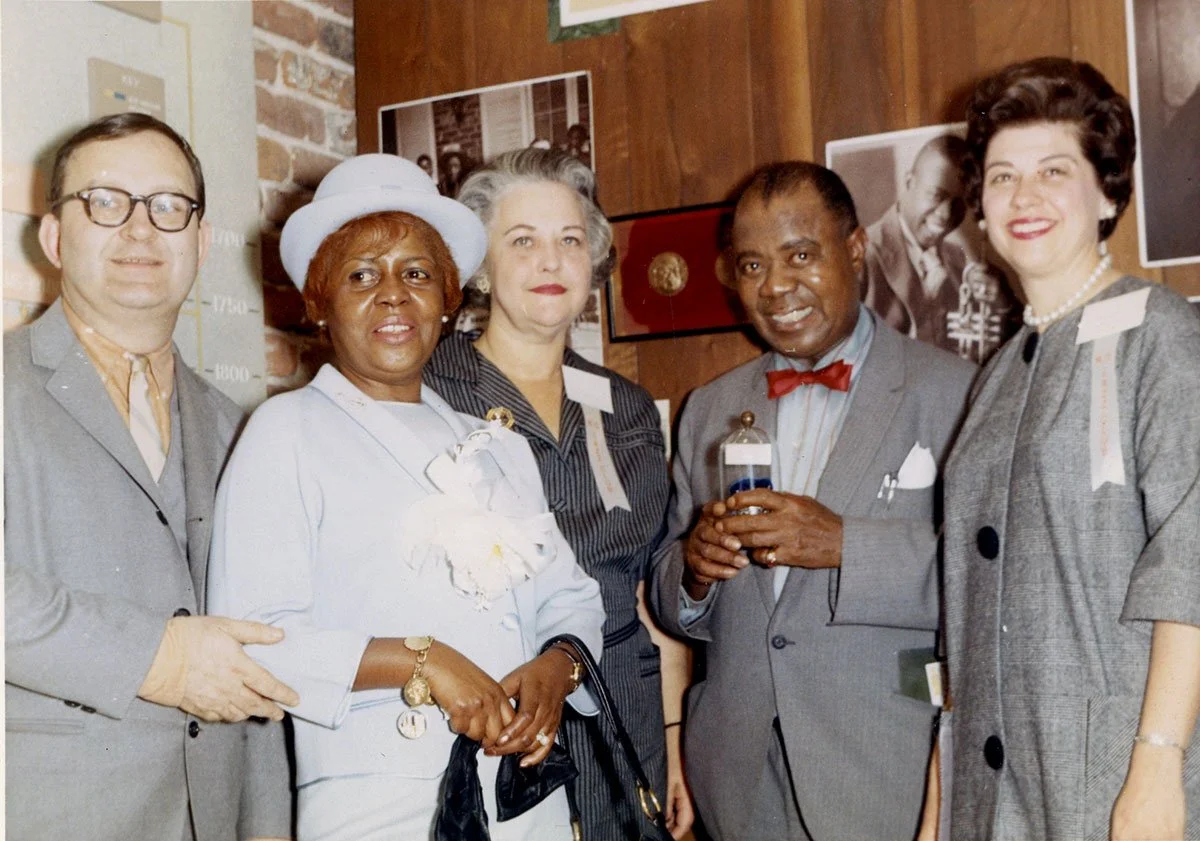 Louis Armstrong with Helen Arlt, president of the Jazz Museum five times, and Jazz Museum curator, Clay Watson, With permission of the Louisiana State Museum/New Orleans Jazz Museum Jazz Club Archives