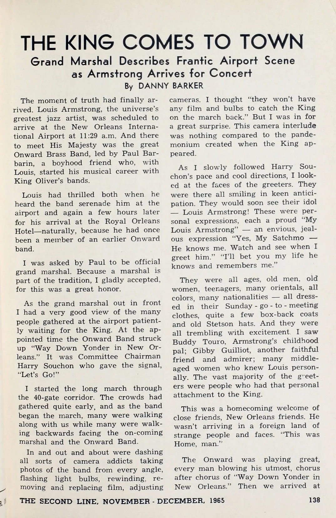 Daniel Moses Barker, Grand Marshall of the Onward Brass Band, was the first friendly hometown face Lucille and Louis Armstrong glimpsed as they emerged from Delta Flight #961. Barker estimated that 900 people had come to greet the legendary musician and marveled at the crowd of all ages and nationalities that had turned out dressed in their “Sunday go to meeting clothes.”