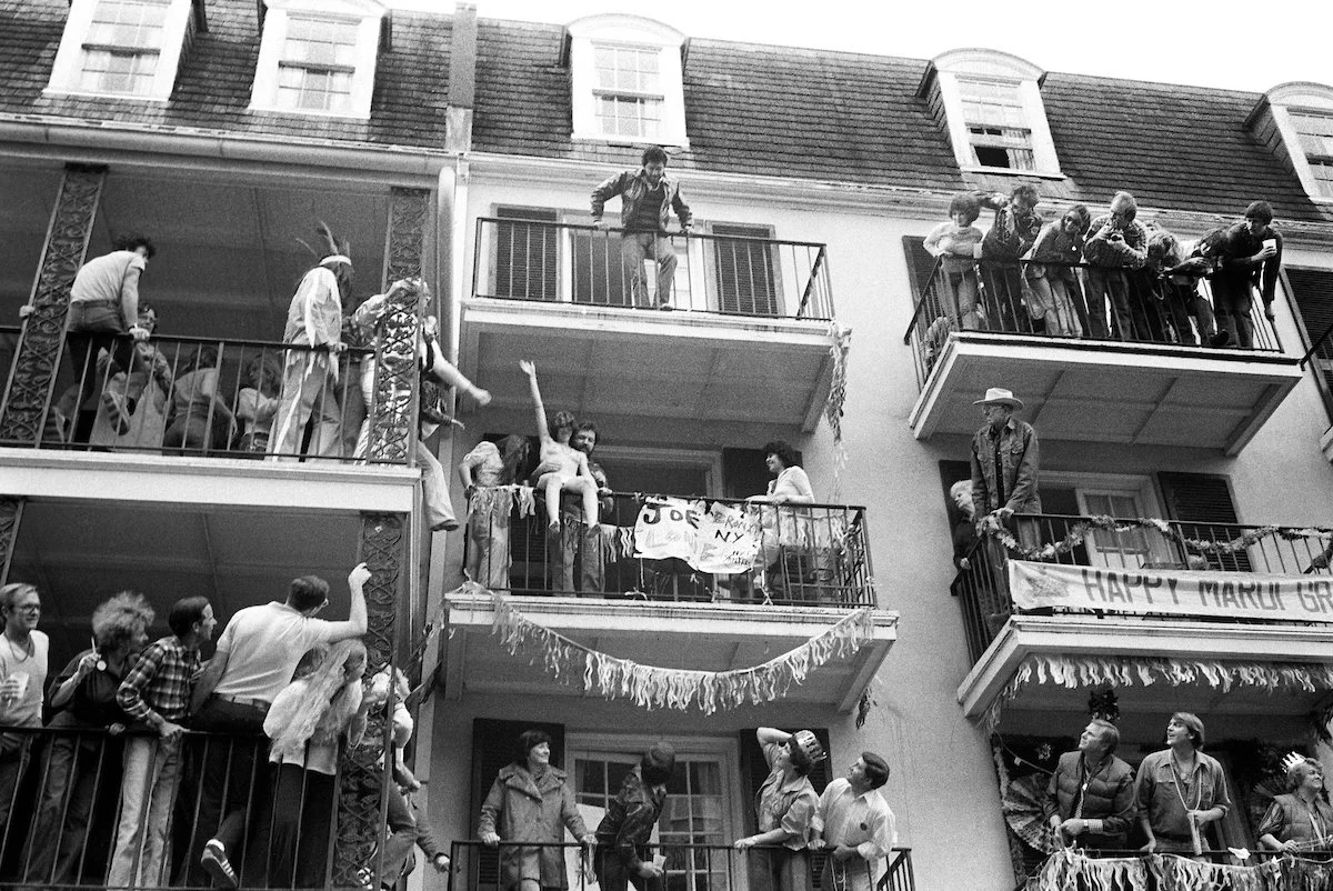 Balconies all through the Quarter, like the ones of this hotel, were packed during the “canceled” Mardi Gras Day,= February 27,1979. Photo© Robbie McClaran, from his book, Mardi Gras 1979, used with his permission. Original prints are available at Martine Chiasson Gallery, 727 Camp St.