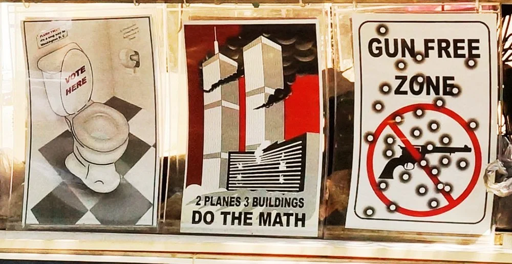 His current best-seller depicts Trump’s grimacing face with a hand flipping the bird, the words “POLITICAL CORRECTNESS!” across the bottom. And another one: the Twin Towers and Building 7, overlaid with the words: “2 PLANES 3 BUILDINGS DO THE MATH.”