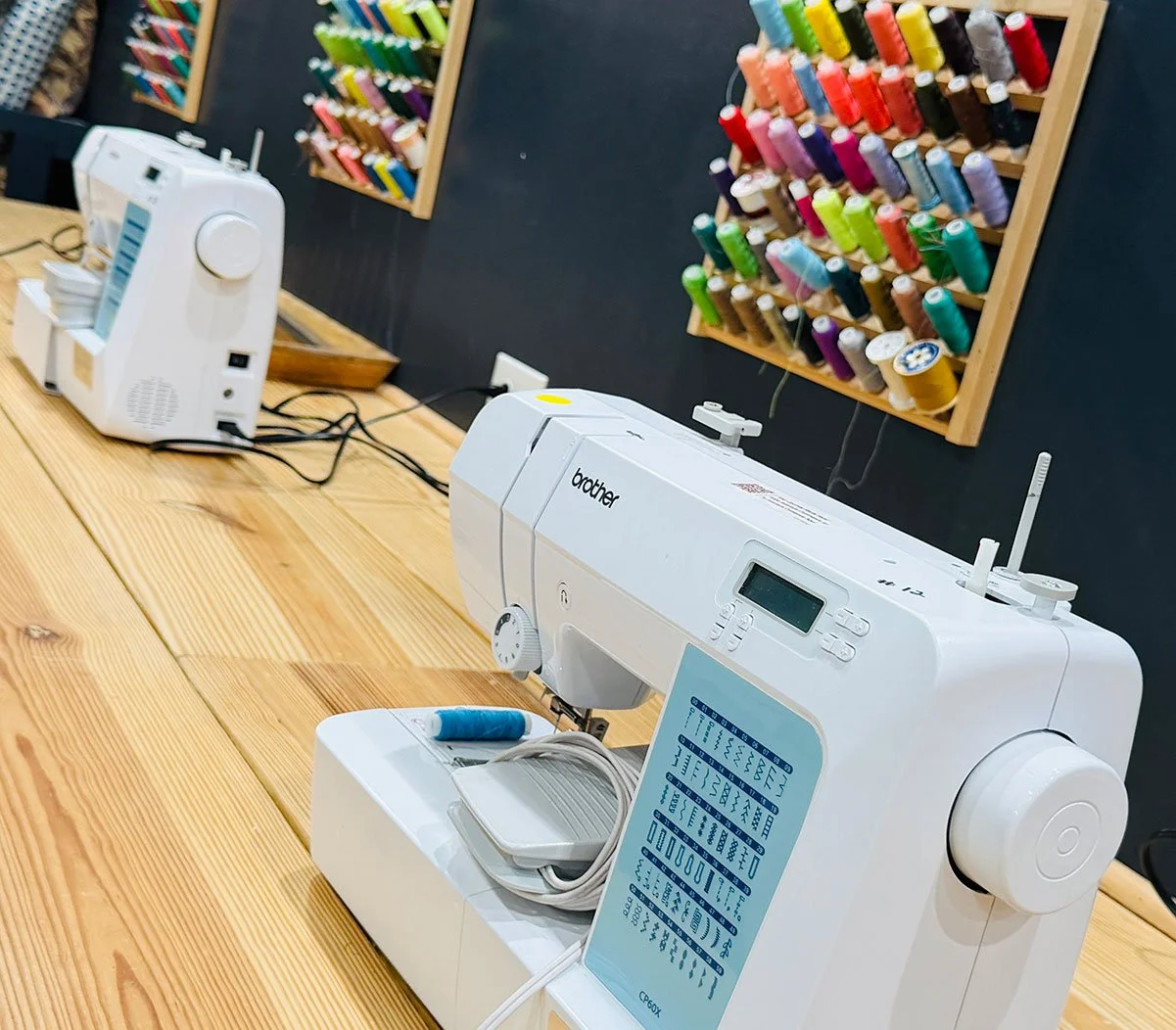 Several sewing stations that are available for classes or for rent to sewers without their own machines